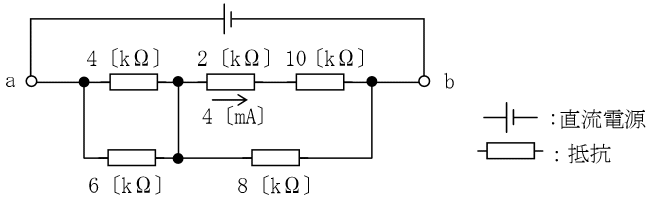 H30DEC 図に示す回路において、端子ab間に直流電圧を加えたところ、2〔kΩ〕の抵抗に4〔mA〕の電流が流れた。8〔kΩ〕の抵抗に流れる電流の値として正しいものを下の番号から選べ。