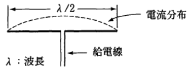 図に示す半波長ダイポールアンテナの給電点インピーダンスは、ほぼ幾らか。