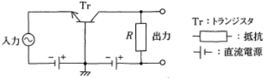 図の回路は[A]形トランジスタを用いて、[B]を共通端子として接地した増幅回路の一例である。この回路は、出力側から入力側への[C]が少なく、高周波増幅に適している。