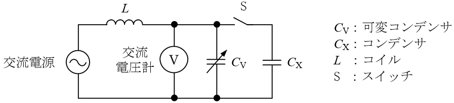 H31APR 図に示す回路において、最初にスイッチSを断(OFF)にしたとき、可変コンデンサCvが、200〔pF〕で電圧計の指示値が最大になった。次にSを接(ON)にしたとき、Cvが50〔pF〕で電圧計の指示値が最大になった。このときの未知のコンデンサCxの値として、正しいものを下の番号から選べ。ただし、コイルの自己インダクタンス、交流電源の周波数及び電圧は一定とする。