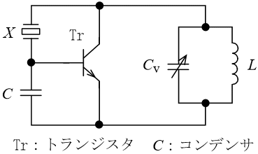 図に示すピアースCB水晶発振回路の原理図において、水晶発振子Xのリアクタンスが誘導性で、ベースとエミッタ間のリアクタンスが容量性であるから、コレクタとエミッタ間の同調回路(コイルL及び可変コンデンサCvの並列回路)が[A]の場合に発振する。したがって、発振を持続させるには、LとCvによる同調周波数を発振周波数よりわずかに[B]すればよい。